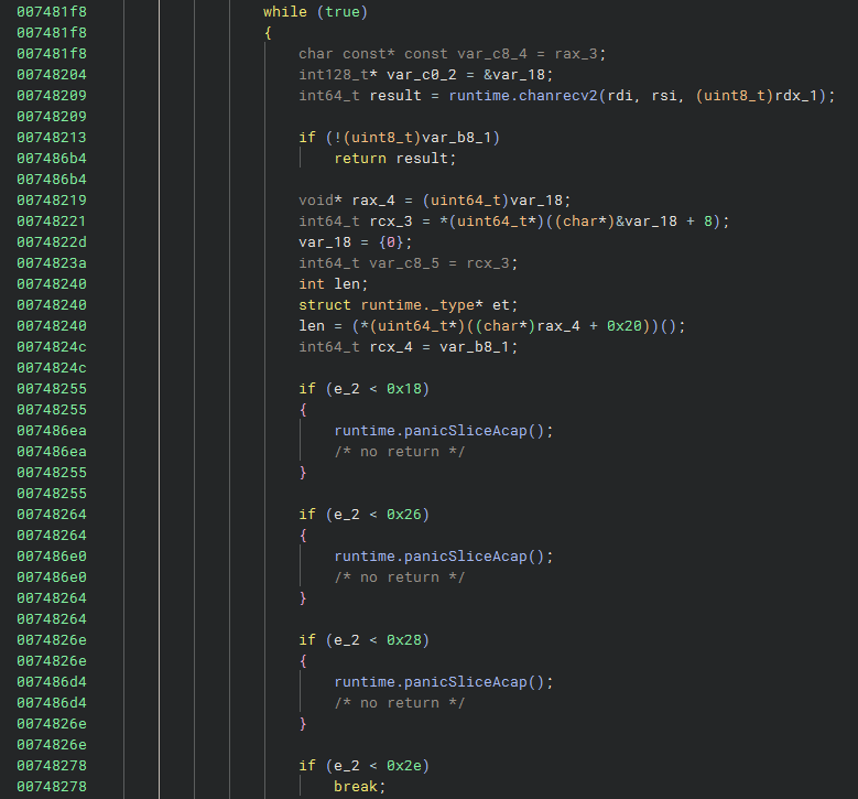 Do you notice something odd? The decompilation and graph layouts are totally off. It’s obvious that the decompilation doesn’t show all the function’s code and this must be an anti-decompilation technique (or just … Golang moment).