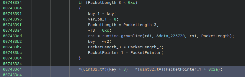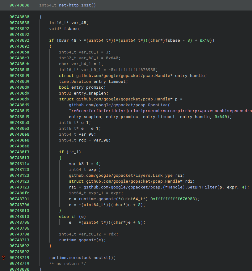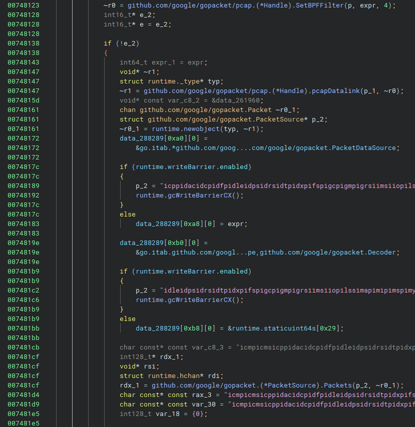 After calling Packets() there is an infinite loop that starts the listener and calls chanrecv to capture packets. We can see the following checks: