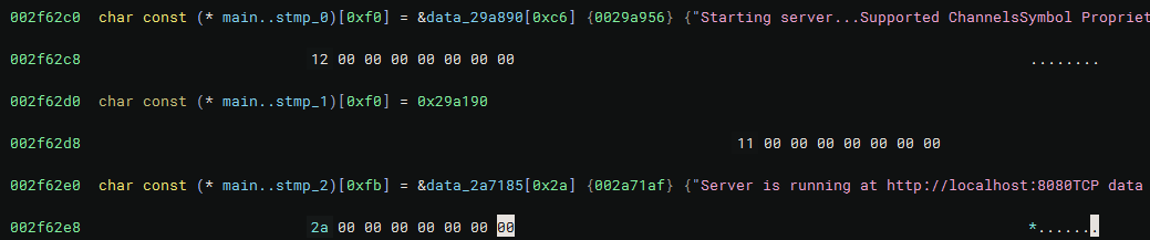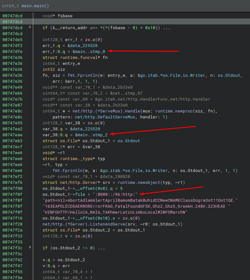The string defined at 0x747f00 is an example of a Golang string of length 5. However, its initialization looks like a big string but this is a decompilation issue. In reality, os_Stdout_1 is just the first 5 bytes of this string; that is :8080.
