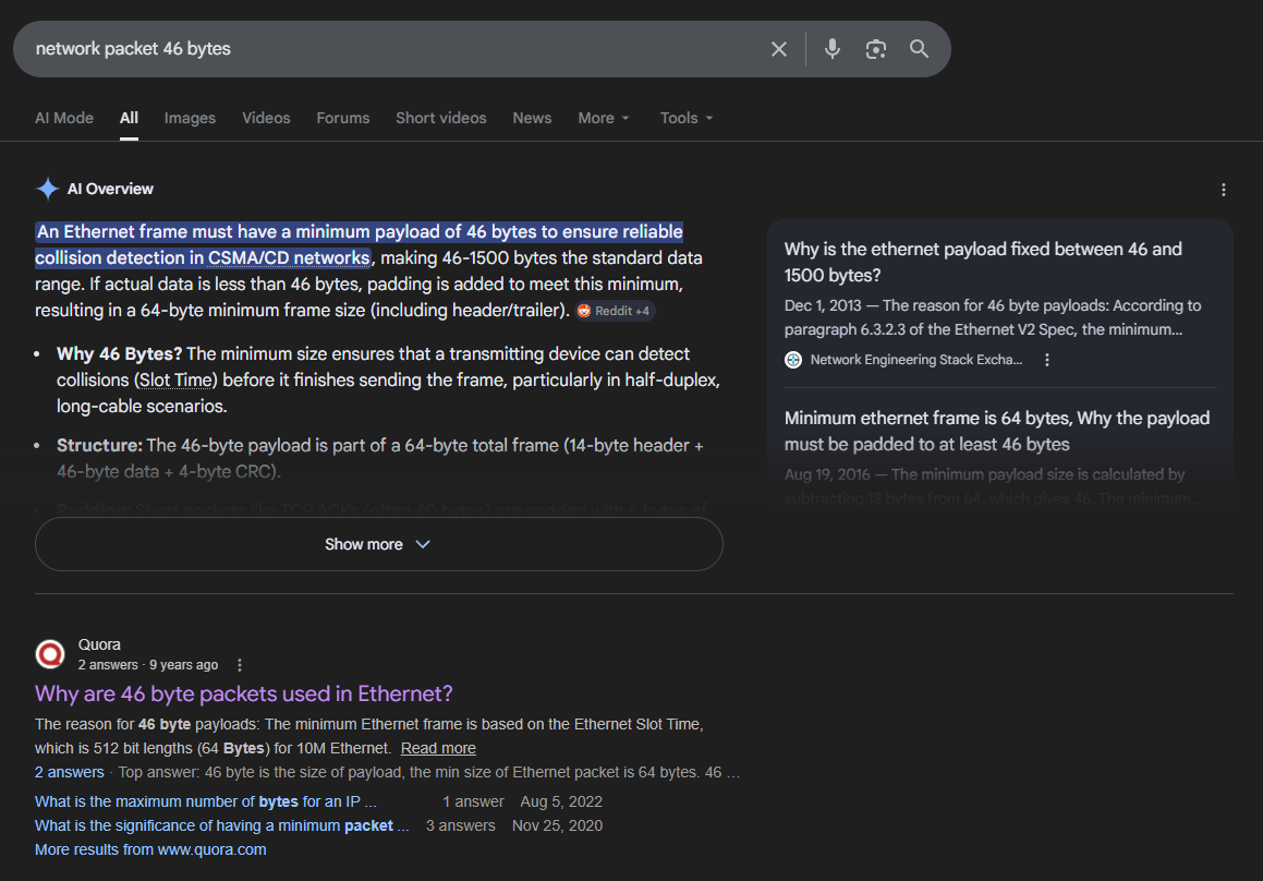 - Extensive use of LLM out of desperation to help me understand why my solution didn’t work. Iirc it suggested me setting all the possible flag bits since the first or two hours while solving, but I was pretty convinced that it was just hallucinating… Maybe I should blindly listen to it, but this suffering forced me to understand exactly how ICMP and IP packets are crafted.