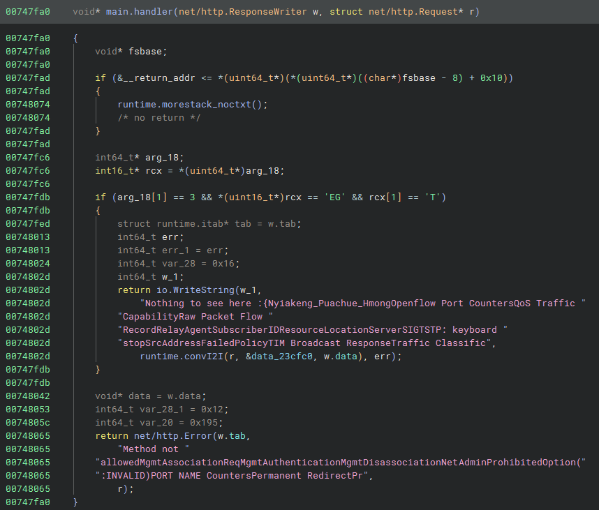 - Symbols are not stripped (thankfully!). Dealing with stripped Golang binaries is a nightmare so the author was quite helpful here.