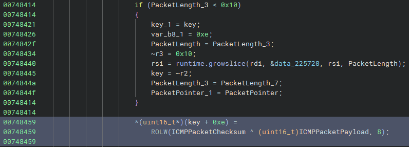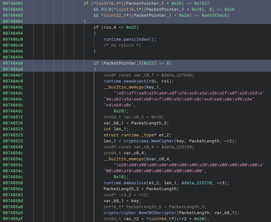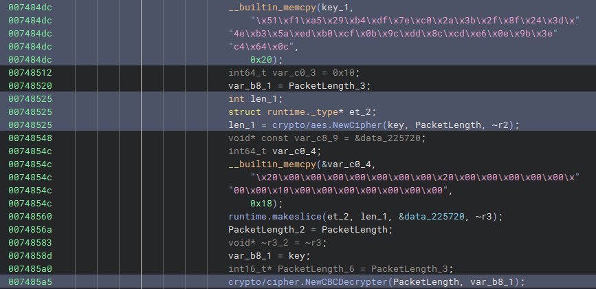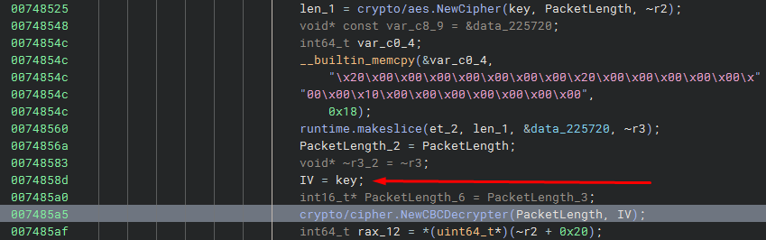 Back to the decompilation, from line 0x7485a5, it’s clear that the IV is the same as the encryption key.