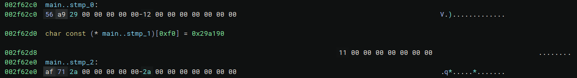 main__stmp_0 is 16-bytes long. The first 8 bytes store a pointer to the address 0x29a956 and the last 8 are the string length (in bytes). We right-click to the bytes 56 and af respectively and press O to define a pointer at this place.
